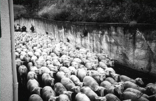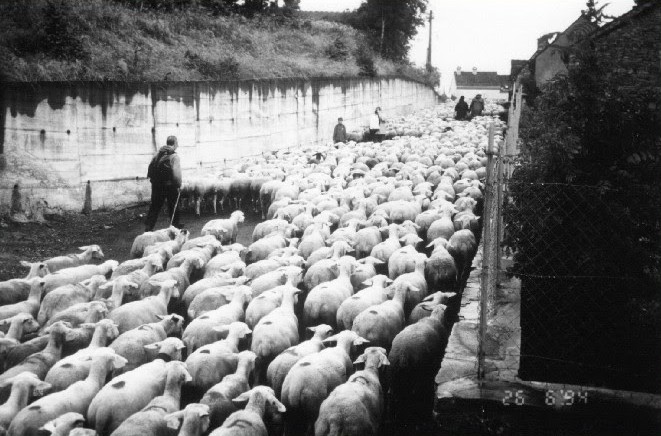 Le spectacle était impressionnant, le troupeau de brebis, soulevant la poussière s’étirait de la maison Bataille jusqu’à La Remise. Il y avait là plus de 3 000 brebis et leurs agneaux et les bêlements, les sonnailles, les cris des bergers les aboiements des chiens se conjuguaient pour donner un concert assourdissant. Le troupeau, en plus des béliards et béliardes, comptait un âne transportant les sacs les plus lourds ainsi que deux ou trois boucs qui faisaient l’attraction avec leurs rubans multicolores et leur odeur caractéristique.