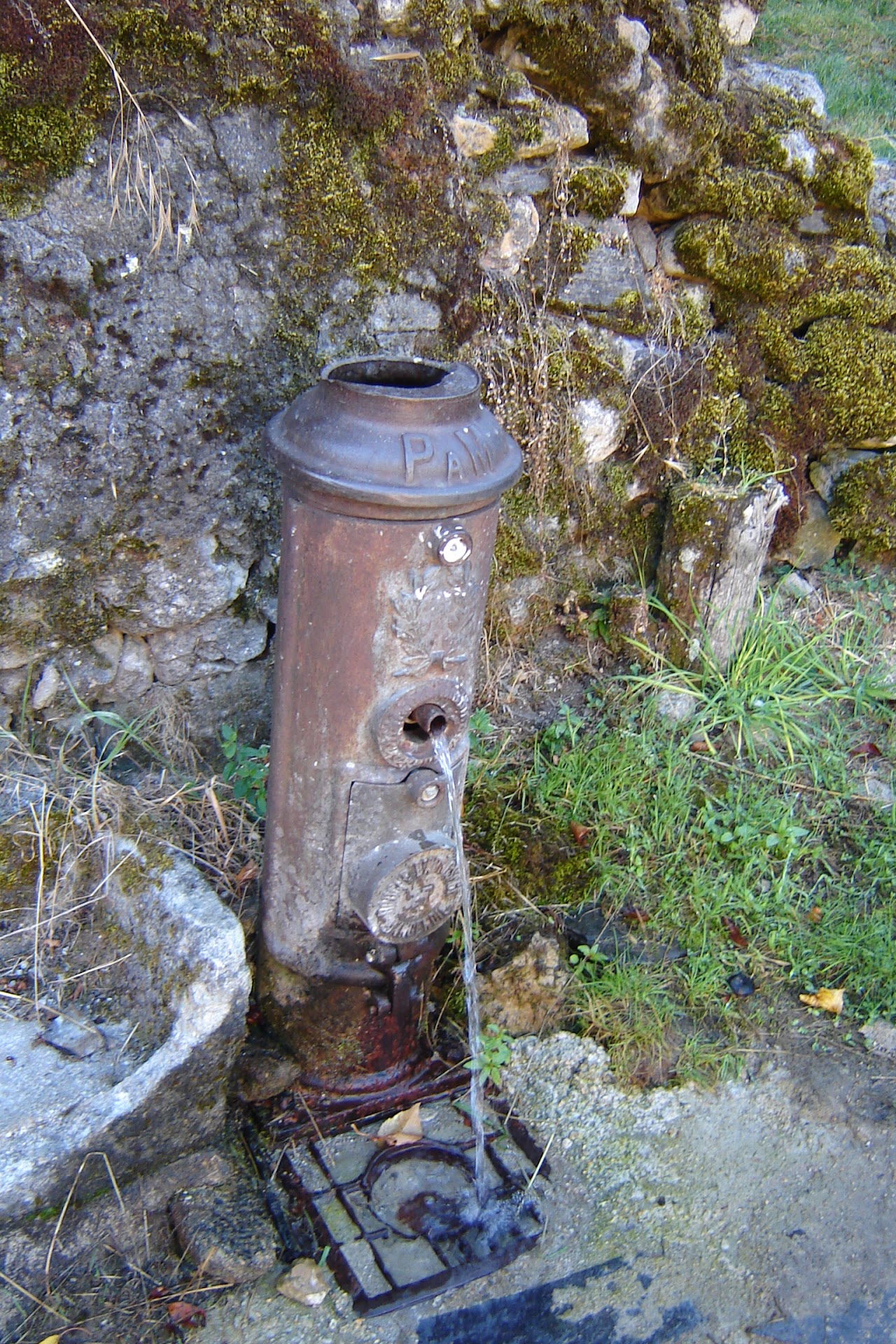 - Les fontaines en fonte, d’où l’eau n’était délivrée qu’à la mise en rotation rapide de la manivelle horizontale, qui les coiffaient. Ces fontaines, au demeurant très belles, grâce à leur ingénieux système participaient à l’écologie avant l’invention du terme. Toujours selon mes souvenirs, trois de ces fontaines sont mises en place : une au dessous de la boulangerie Mazoyer, une au fond du Bleymard, une au bas du boulagiou de la Barri-Basse.