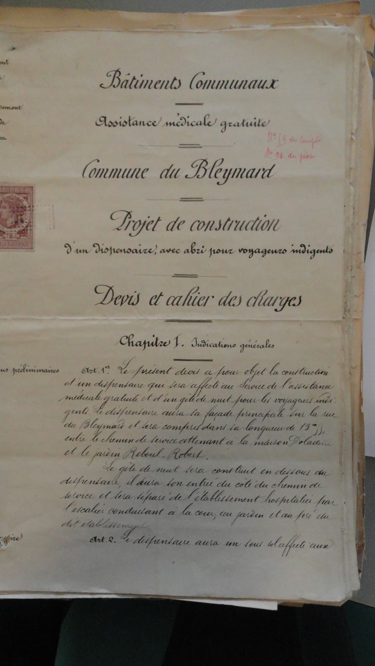 Art. 1ᵉʳ. Le présent devis a pour objet la construction d’un dispensaire qui sera affecté au service de l’assistance médicale gratuite et d’un gîte pour voyageurs indigents. Le dispensaire aura sa façade principale sur la rue du Bleymard et sera compris dans sa longueur de 13ᵐ55, entre le chemin de service attenant à la maison Doladille et le jardin de Reboul Robert.