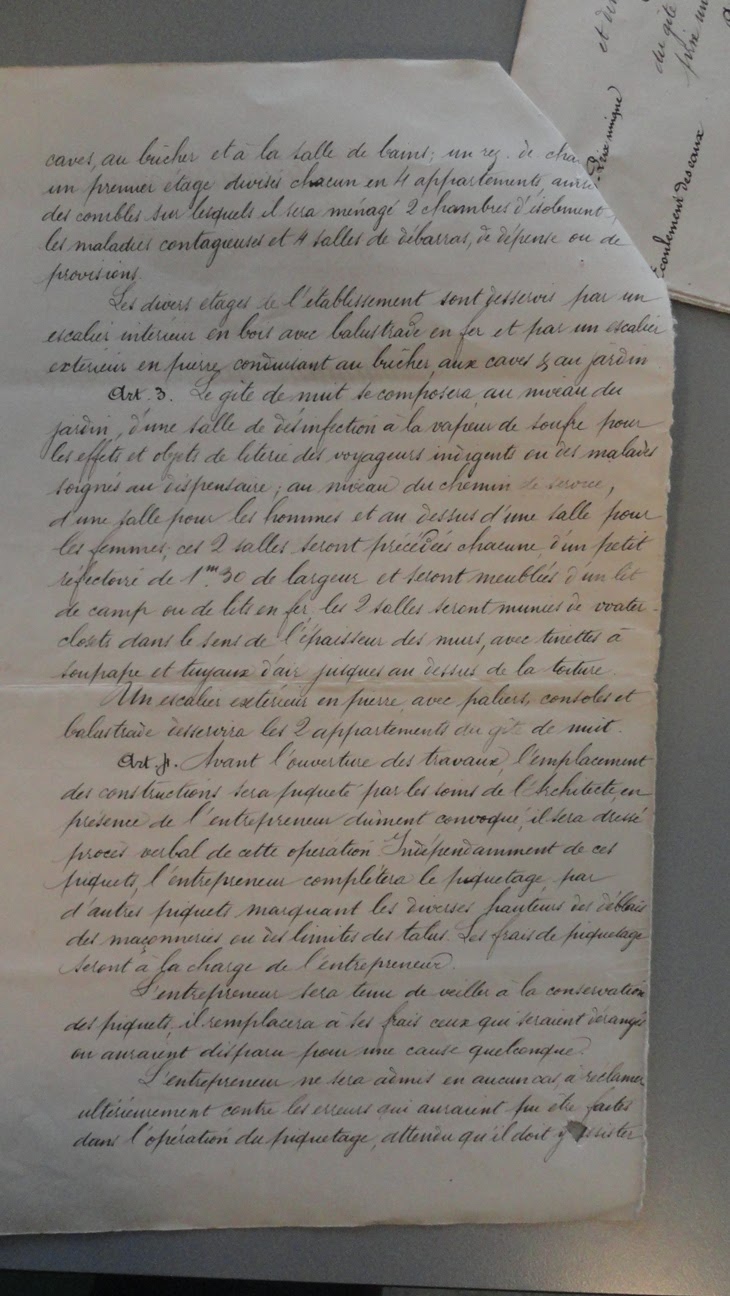 ART 3 : Le gîte de nuit se composera au niveau du jardin d’une salle de désinfection à la vapeur de soufre pour les effets et les objets de literie des voyageurs indigents ou de malades soignés au dispensaire, au niveau du chemin de service d’une salle pour les hommes et au dessus d’une salle pour les femmes ; ces 2 salles seront précédées chacune d’un petit réfectoire de 1ᵐ30 de largeur et seront meublées d’un lit de camp ou de lits en fer. Les 2 salles seront munies de water-closets dans le sens de l’épaisseur des murs, avec tinettes à soupapes et tuyau d’air jusqu’au dessus de la toiture.