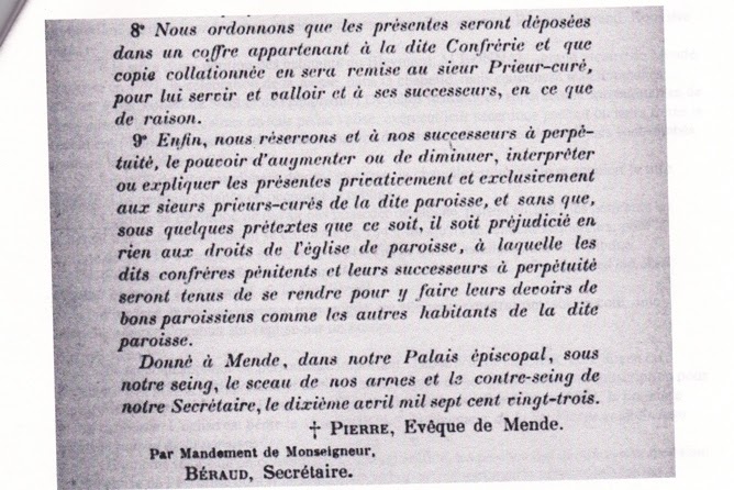 La Confrérie des Pénitents blancs de Notre Dame de Confalon, fut créée au Bleymard par acte solennel de Pierre, évêque de Mende le 10 avril 1723. Cet acte fut approuvé par Rome, par une bulle du pape Benoît en date du 6 mars 1732, qui de plus  accorda les indulgences attachées à une telle confrérie. La photocopie, partielle de ce document, intéressant à plus d’un titre, est rapportée ci-après.