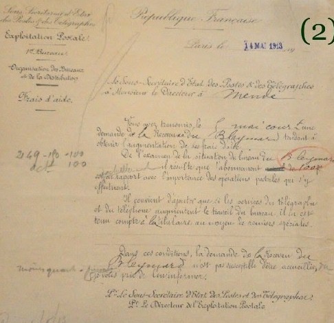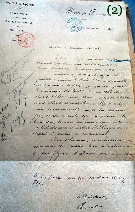 Le Directeur transmet cette demande au Directeur Général, avec avis favorable, pour une indemnité de 20 F (!), « car la mairie de Cubiérettes, qui sert d’école, ne peut pas servir d’abri et qu’il n’est pas possible d’échanger le courrier en plein air. »