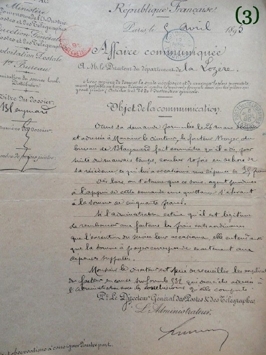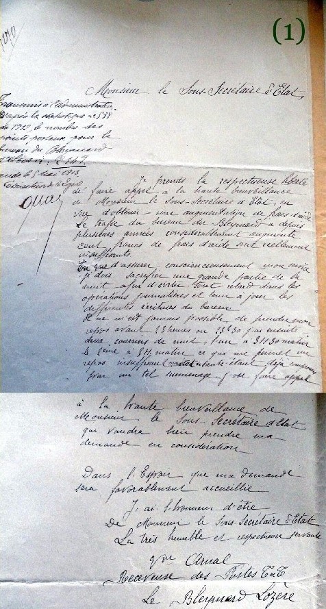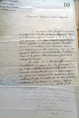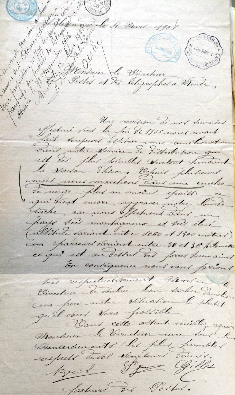 M. Vidal, meunier à Cubierettes reçoit, tous les jours, à son domicile le facteur du Bleymard et un sous-facteur relais afin qu’ils échangent leur courrier à l’abri. Il présente une requête au Directeur en vue d’obtenir une indemnité pour le dédommager de ce dérangement (et peut-être du coup de rouge qu’il offrait aux facteurs à cette occasion). Il termine sa missive par cette formule que je trouve délicieuse :