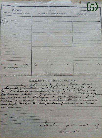 À l’issue de l’hiver de 1895, il demande un défraiement de 50 F pour ces hébergements, mais il présente une quittance de seulement 35 F, car les petits services (abri, vêtements…) ne sont évidemment pas facturés.