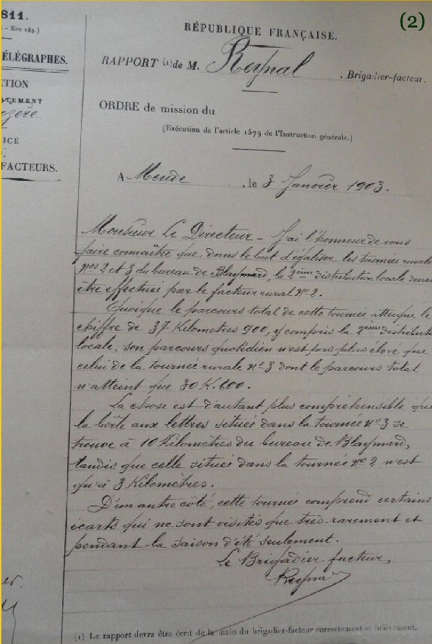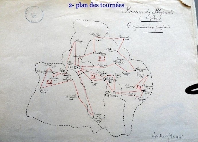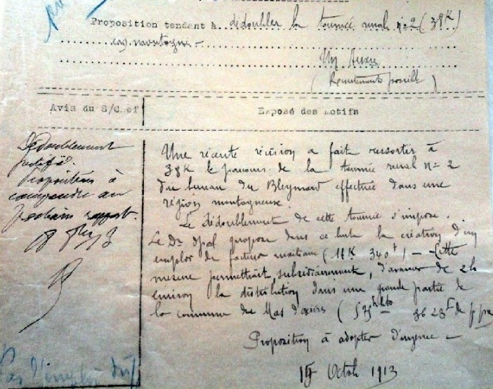 Une tournée auxiliaire sera créée pour desservir le village du Bleymard, celui de Saint-Jean et quelques écarts. La création de cette tournée, de 11 km, réduira la charge de l’épouvantable tournée n° 2 (37,8 km) devenue d’autant plus pénible que « l’instituteur de Serviès2 s’est abonnée à un journal quotidien ».