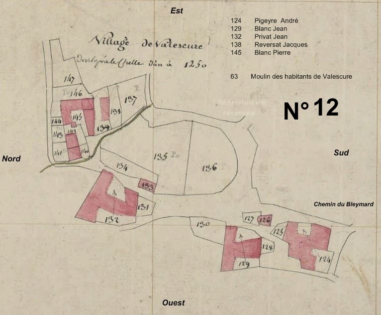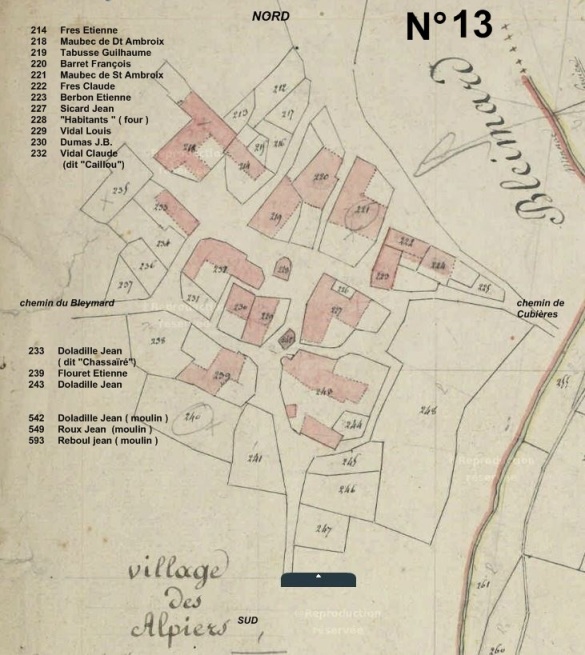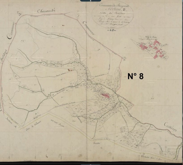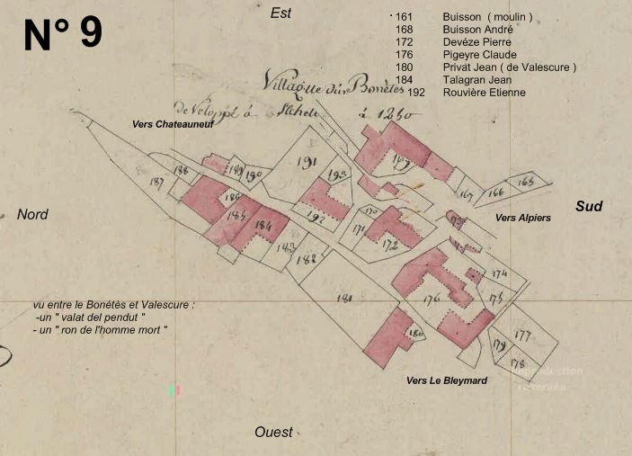 Cette question, d’importance tout à fait anecdotique, m’a fourni le prétexte (toujours à contre courant, à contre sens, à contre mode…) d’étudier les plans cadastraux du Bleymard et des environs, de rechercher les noms des propriétaires de l’époque en mentionnant à même les plans les noms les plus évocateurs pour moi (Buisson, mon ancêtre, Rainal, Turc, Devèze, Ferrand, etc.)