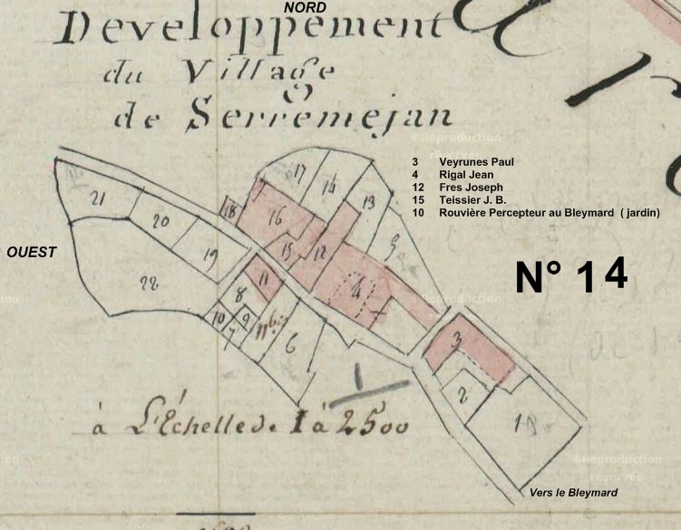 Une amie de longue date, fille de ma première institutrice, Jeanne Raynal, veuve Cayrol, m’a fait savoir que la ruelle séparant l’ancien cours complémentaire de la maison Devèze (16 et 17 du plan 1819) rejoignait le boulagiou du Barri (ex-boulagiou du Bizat) en longeant les maisons Devèze, Reboul, Pons, Mazoyer, Massador, Médard… (17, 18, 19, 35, 40, 43, 44 du plan de 1819)