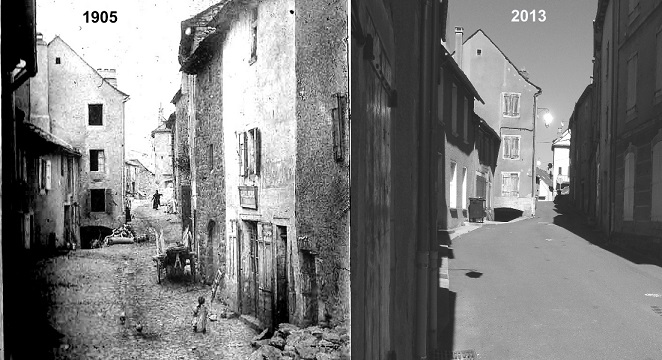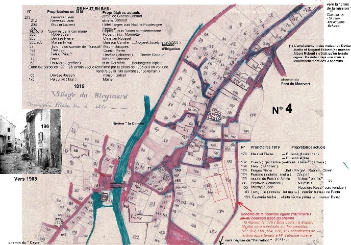 L’examen sur place et les photos prises du même endroit (ci-jointes) font apparaître que l’espace non bâti se situe un à deux mètres au dessous du boulagiou dit du Barri. En aucun cas il ne peut s’agir de l’actuelle montée vers l’église (entre les anciennes maisons d’Ullysse Bros et de Montavit). On aurait pu penser à une rue entre la rue principale et le Couderc. En fait, du plan cadastral de 1819, il ressort qu’entre les parcelles 196 et 192 il existait un terrain vague.