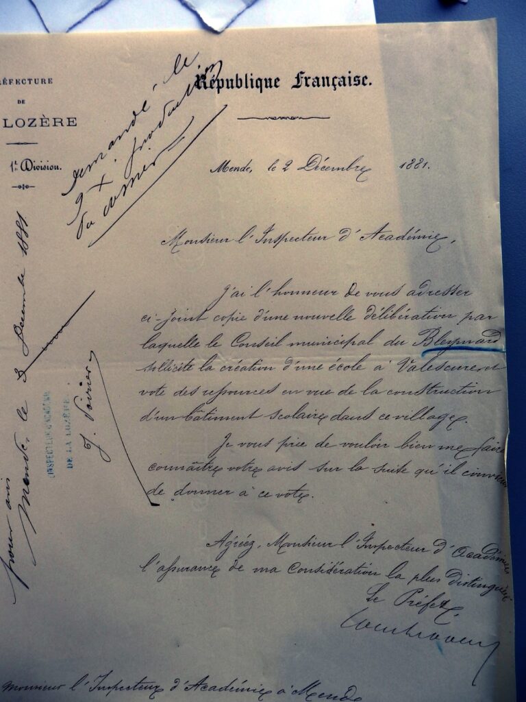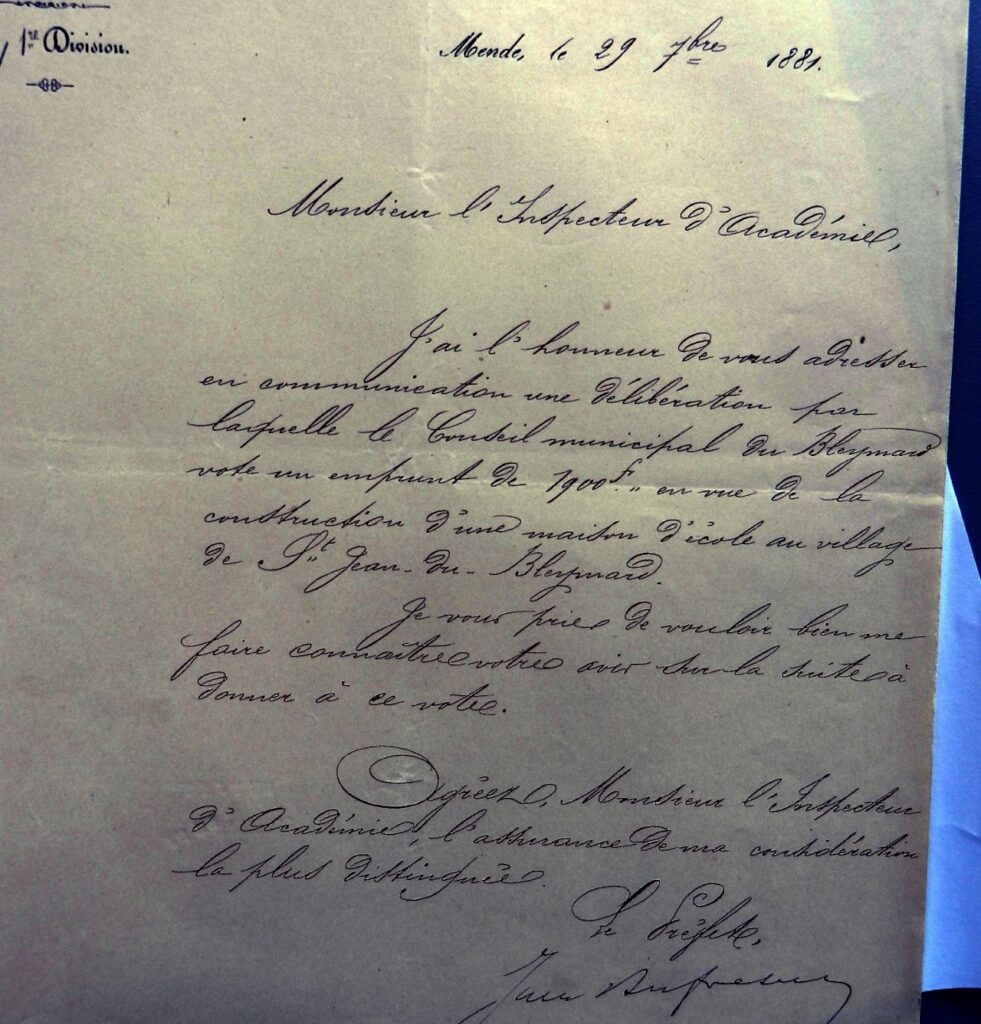 En 1881 à la suite de la loi de Jules Ferry instituant l’école gratuite et obligatoire, jusqu’à l’âge de 13 ans de nombreux villages demandent l’ouverture d’une école. C’est le cas de Valescure, de Saint-Jean du Bleymard, du Bonnetès… Les copies de deux démarches concernant les villages de Valescure et de Saint-Jean sont visibles ci-dessous.