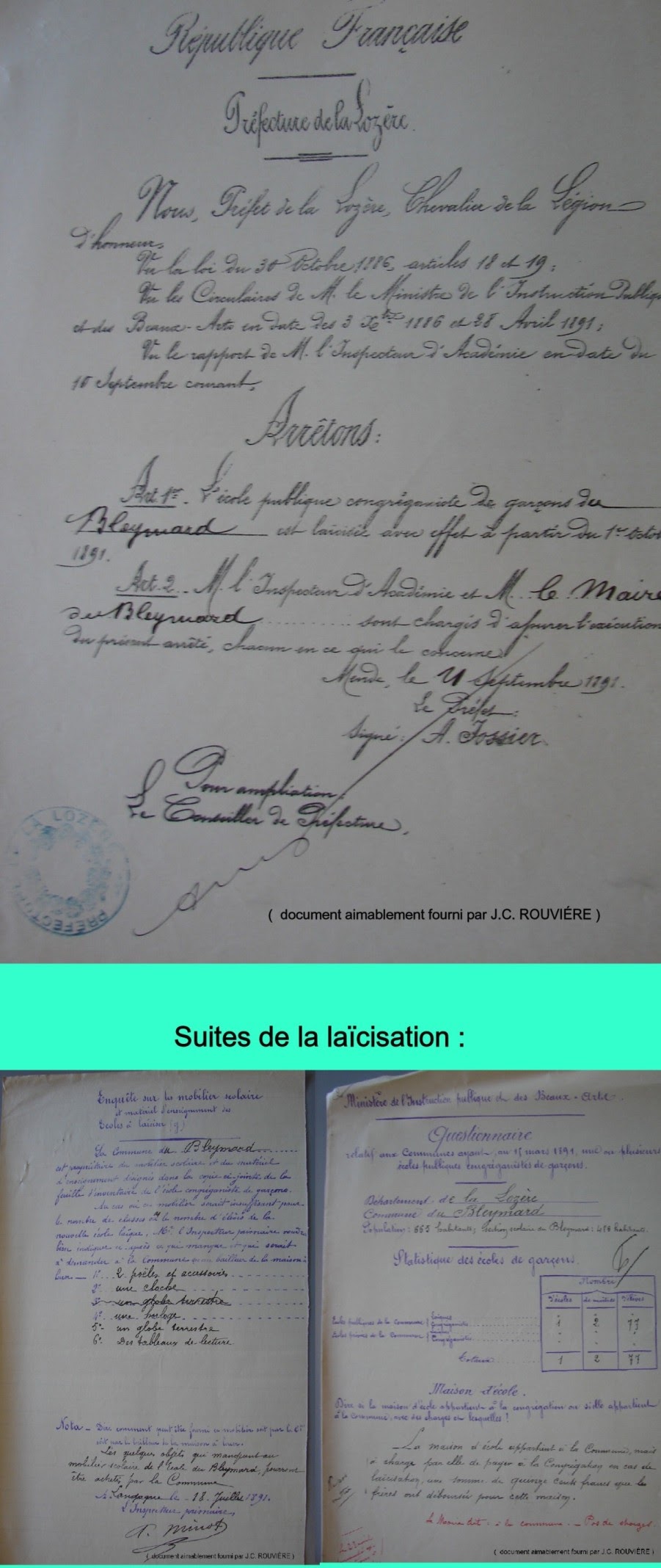 La loi du 30 octobre 1886 ordonnant la laïcisation de toutes les écoles publiques, l’école du Bleymard ne pouvait échapper à ses coups et le 1ᵉʳ octobre 1891 le frères durent remettre le local à un instituteur laïque (vraisemblablement M. Massador). Ce fut un coup terrible pour la population et surtout pour le bon M. Olier. …