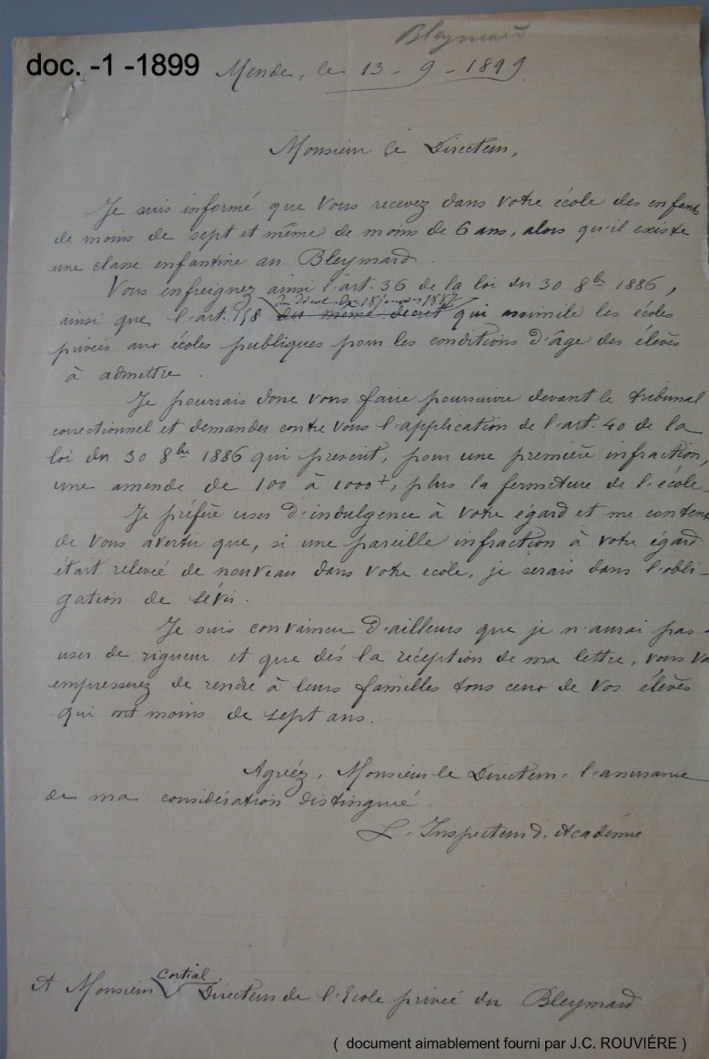À Monsieur Cortial, Directeur de l’école privée du Bleymard.