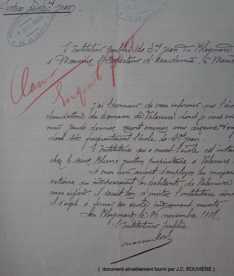 Dénonciation par l’instituteur de Saint-Jean, à l’inspecteur d’académie, de l’existence d’une école clandestine à Valescures.