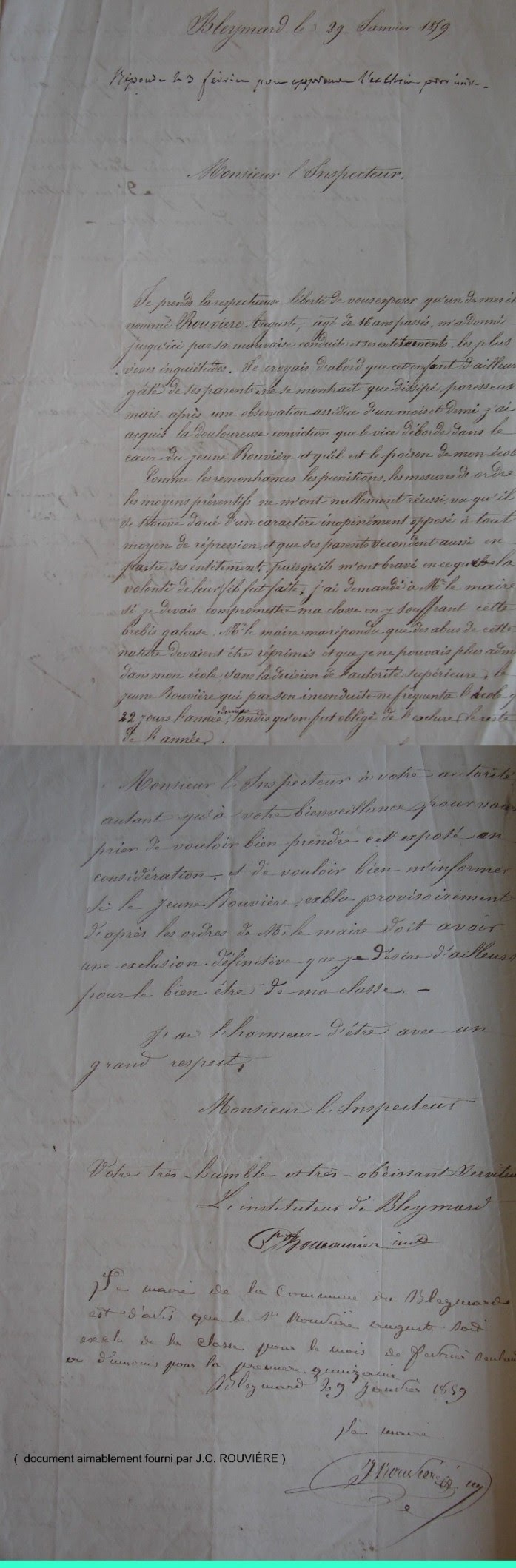 Comme les remontrances, punitions, les mesures d’ordre, les moyens préventifs ne m’ont nullement réussi, vu qu’il se trouve doué d’un caractère inopinément opposé à tout moyen de répression et que ses parents secondent aussi en partie ses entêtements, puisqu’ils m’ont bravé en ce que la volonté de leur fils fut faite, j’ai demandé à M. le maire si je devais compromettre ma classe en souffrant cette brebis galeuse. M. le maire m’a répondu que des abus de cette nature devaient être réprimés et que je ne pouvais plus admettre dans mon école dans la décision de l’autorité supérieure, le jeune Rouvière qui par son inconduite ne fréquente l’école que 22 jours l’année classique, tandis qu’on fut obligé de l’exclure le reste de l’année.