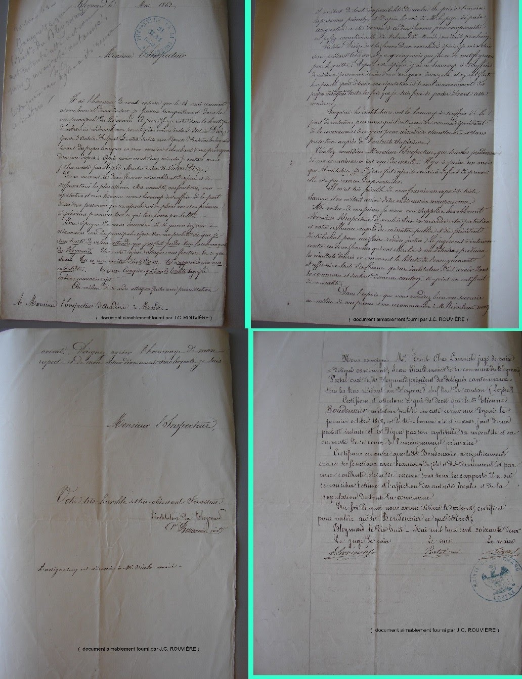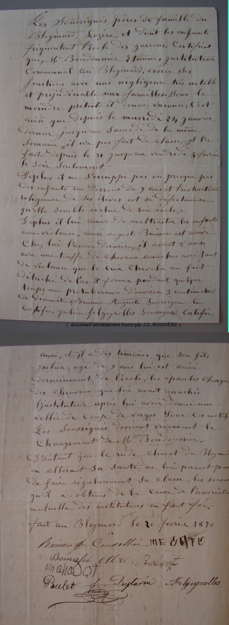 Les soussignés pères de famille du Bleymard, Lozère, et dont les enfants fréquentent l’école des garçons, certifient que M. Boudoussier Étienne, instituteur communal au Bleymard, exerce ses fonctions avec une négligence très notable et préjudiciable aux familles.