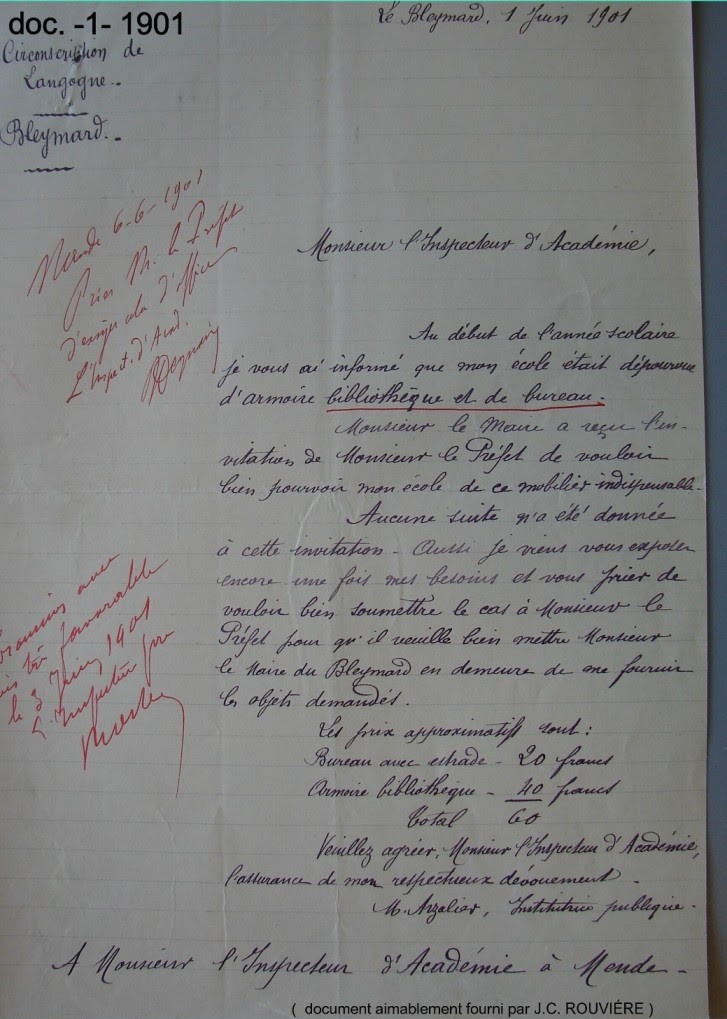 L’Instituteur public de St Jean du Bleymard à Monsieur l’Inspecteur d’Académie à Mende.