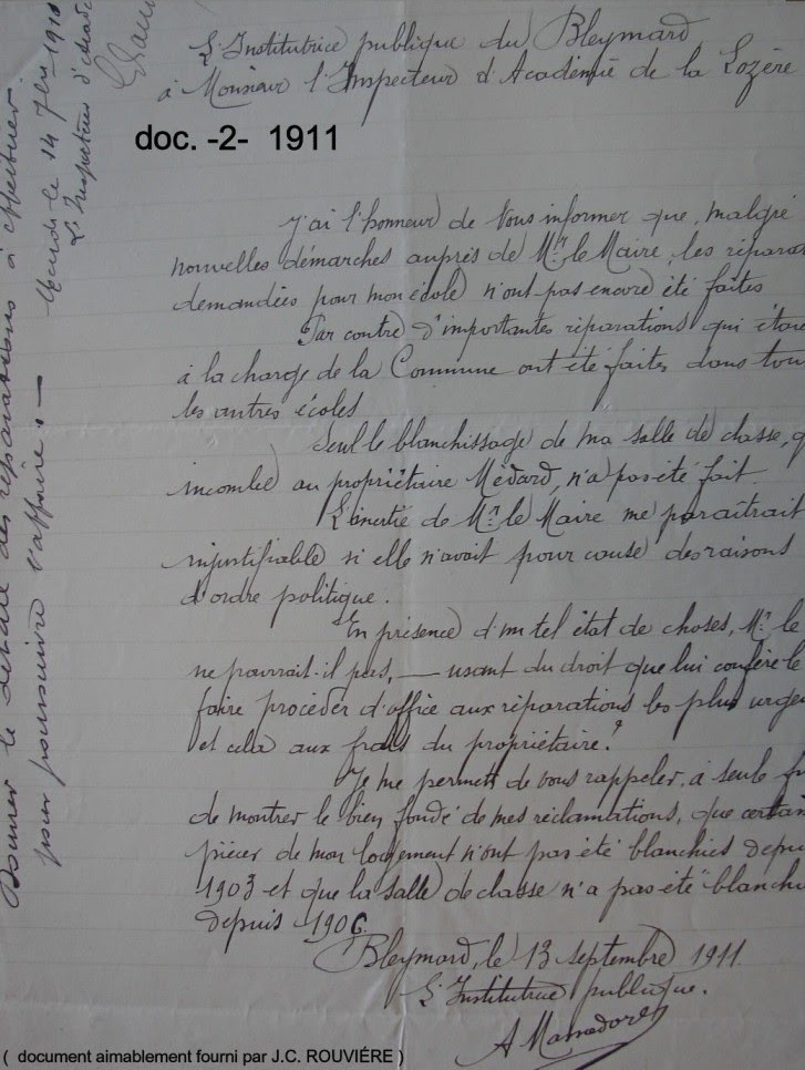 L’institutrice publique du Bleymard à Monsieur l’Inspecteur d’Académie de la Lozère