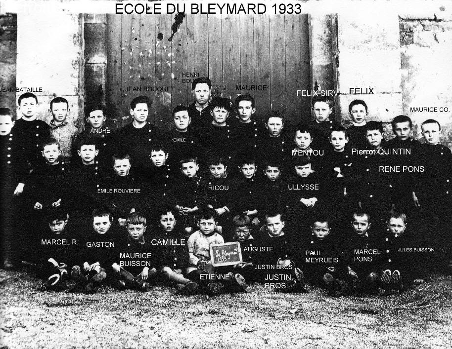 Je n’ai retrouvé qu’une seule photographie des écoliers du primaire. Elle date de 1933, j’ai connu tous ceux qui y figurent, dont mon frère, Camille, au premier rang. Fort peu (une dizaine) sont encore parmi nous, et on peut regretter l’absence des maîtres sur le cliché.