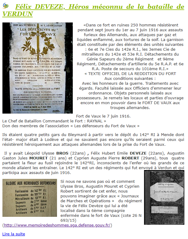 Si nous ne savons pas où et comment Ulysse Bros, Augustin Mouret et Cyprien Robert sortirent de cet enfer, nous pouvons imaginer grâce aux « Journaux de Marches et Opérations »   du régiment la vie de Félix Devèze qui lui a été localisé dans la 6ème compagnie enfermée dans le fort de Vaux (cote 26 N 693/15)(http://www.memoiredeshommes.sga.defense.gouv.fr/)