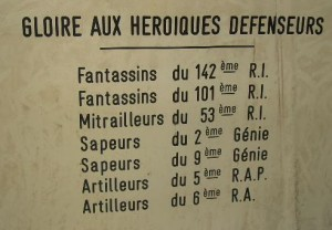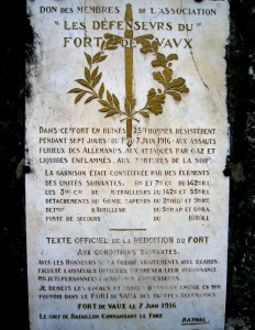«Dans ce fort en ruines 250 hommes résistèrent pendant sept jours du 1er au 7 juin 1916 aux assauts furieux des Allemands, aux attaques par gaz et liquides enflammé, aux tortures de la soif. La garnison était constituée par des éléments des unités suivantes : 6e et 7e Cies du 142e R.I., les 3emes Cie de mitrailleurs du 142e et 53e R.I. Détachements du Génie Sapeurs du 2ème Régiment   et 9ème Régiment, Détachements d’artillerie du 5e R.A.P. et 6e R.A. Poste de secours du 101ème R.I.»